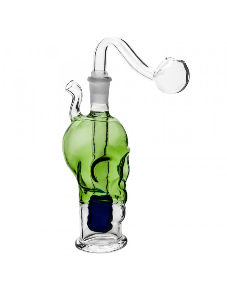Компактний бонг для кристалів із виразним дизайном у формі черепа — модель, яка одразу привертає увагу. Незвична форма додає характеру, а прозора нижня частина підкреслює конструкцію та створює цікавий візуальний контраст.