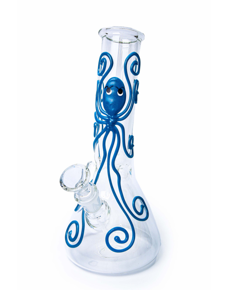 Скляний бонг із яскравим дизайном, який одразу привертає увагу завдяки незвичайному малюнку медузи на корпусі. Декоративні лінії щупалець плавно проходять по шахті та колбі, створюючи ефект руху і роблячи модель помітною серед класичних бонгів. Особливістю цього бонга є те, що малюнок світиться в темряві, завдяки чому аксесуар виглядає ще більш ефектно у вечірній атмосфері або при приглушеному освітленні.
