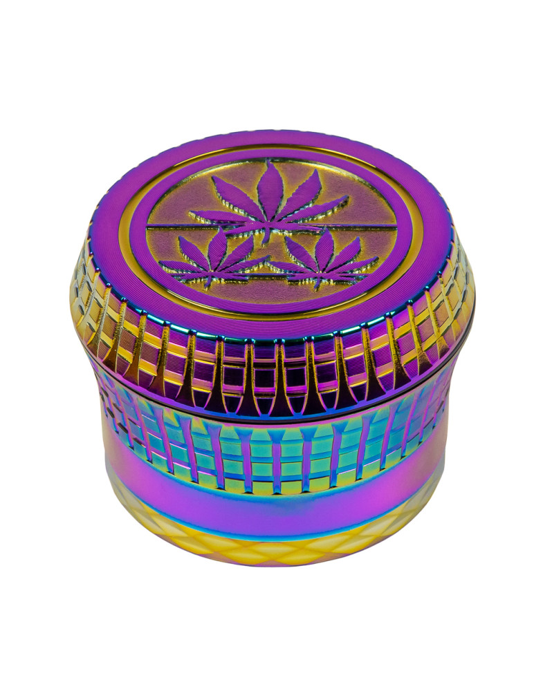 Металевий гріндер із ефектним покриттям у стилі хамелеон поєднує функціональність і акуратний сучасний вигляд. Завдяки компактним розмірам він зручно лежить у руці та підходить як для домашнього використання, так і для транспортування. Конструкція складається з трьох відділів: верхній використовується для подрібнення, середній оснащений ситом для відділення дрібних частинок, а нижній служить контейнером для їх збору.