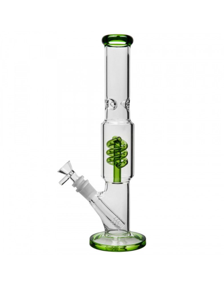 Эта модель привлекает внимание современным дизайном с внутренним перколятором в форме спирали. Такая конструкция не только выглядит эффектно, но и выполняет важную функцию — дополнительную фильтрацию дыма. Во время использования дым проходит через перколятор, разбивается на мелкие пузырьки и лучше охлаждается в воде.