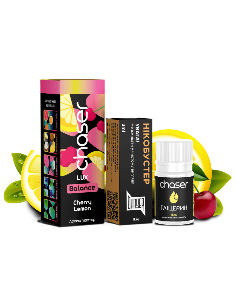 Набір Chaser Lux Cherry Lemon — яскраве поєднання соковитої вишні та свіжого лимона, що створює насичений і водночас освіжаючий смаковий профіль. Солодка, злегка терпка вишня гармонійно доповнюється цитрусовою кислинкою лимона, даруючи збалансований смак із приємним фруктовим післясмаком. Легкий кисло-солодкий акцент робить аромат виразним і підходить для щоденного використання.