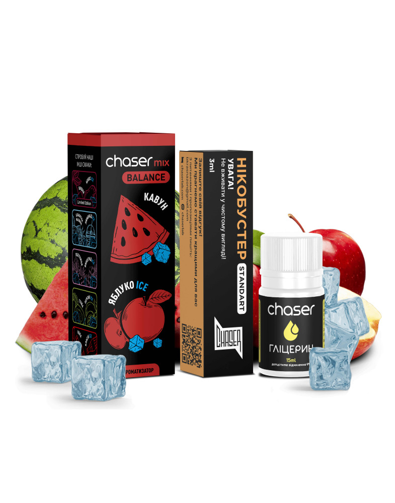 Набір Chaser Mix Кавун Яблуко Ice 30 мл — яскравий фруктовий мікс із вираженим охолоджуючим ефектом. Солодкий стиглий кавун створює соковиту, м’яку основу, а зелене яблуко додає приємної кислинки та свіжого хрумкого акценту. Нота ice підсилює композицію легкою прохолодою, залишаючи освіжаючий післясмак.