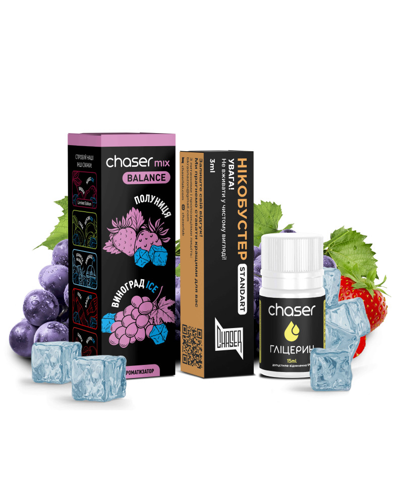 Набір Chaser Mix Полуниця Виноград Ice 30 мл — яскравий ягідний мікс із приємним освіжаючим ефектом. Солодка стигла полуниця гармонійно поєднується з соковитим виноградом, а легкий холодок додає смаку свіжості та виразності.