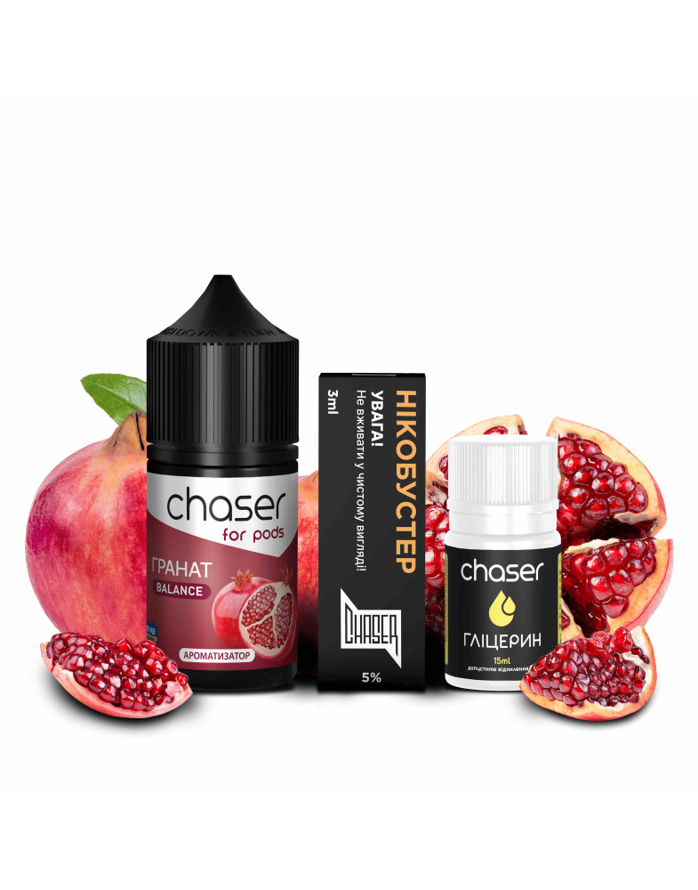 Набір Chaser Гранат 30 мл — це насичений смак стиглого граната з виразною соковитістю та приємною природною кислинкою. Аромат передає характер свіжої гранатової м’якоті з легкою терпкістю, що додає глибини та яскравості. Смак розкривається поступово: спочатку відчувається солодкий фруктовий акцент, який переходить у помірну кислинку з освіжаючим післясмаком.