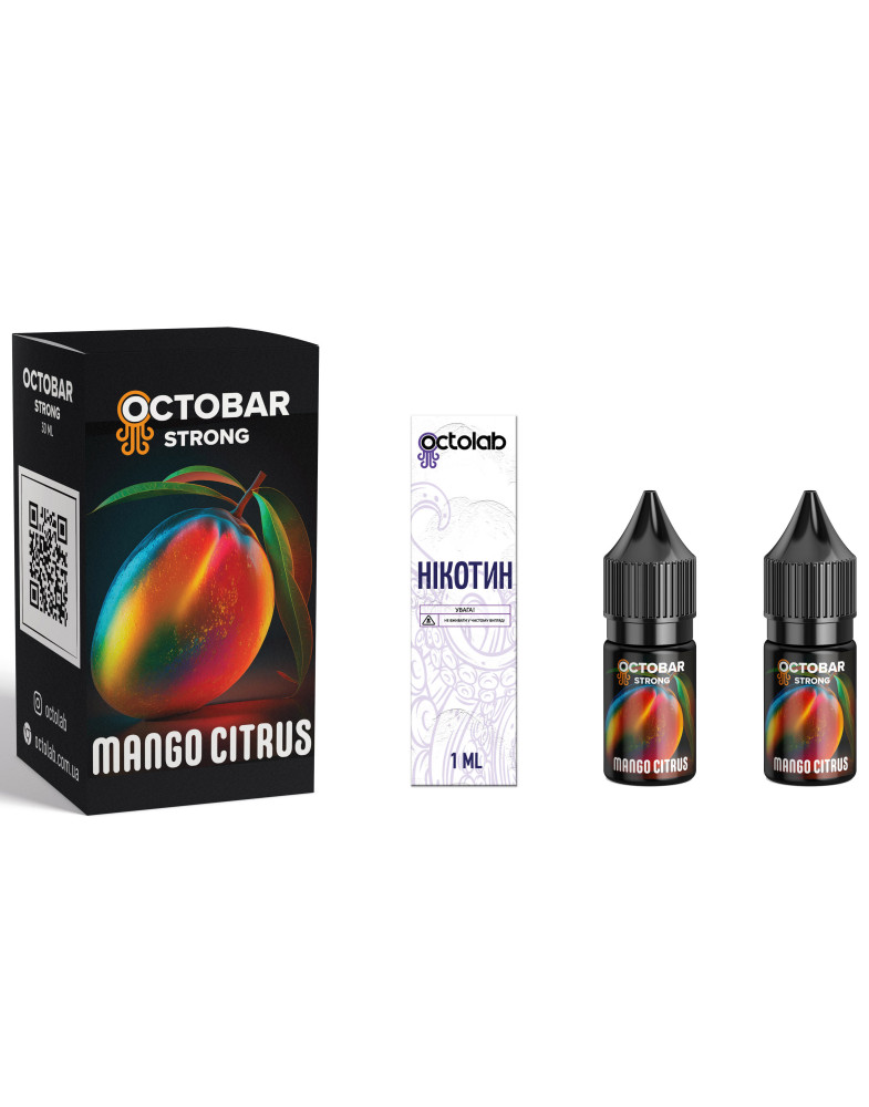 Набір Octobar Strong Mango Citrus об'єднує в собі насичений смак стиглого манго з освіжаючими цитрусовими акцентами. Цей тропічний мікс ідеально підійде любителям насичених і бадьорих ароматів. З оптимальною густотою рідина гарантує комфортне ширяння і рясну кількість пари.